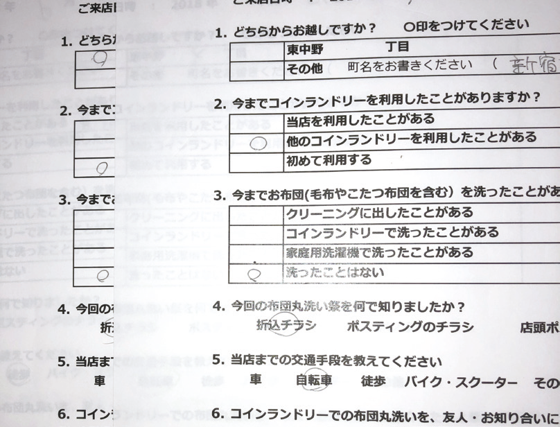東中野店では、電動自転車で20分かかるという自宅から初日の金曜日に料金等を調べにやってきた女性がおり、「土・日は混むわね」と言って帰っていったが、最終日の月曜日に電動自転車の前と後ろに5枚ものふとんを載せて再来店。