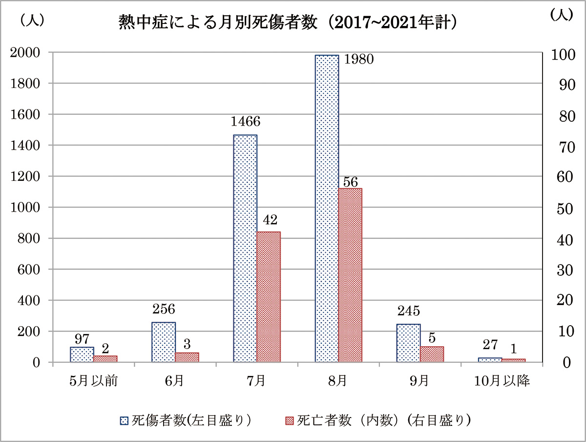 熱中症の死傷者は夏場が圧倒的に多いが、5月以前、10月以降にも死亡者もいる